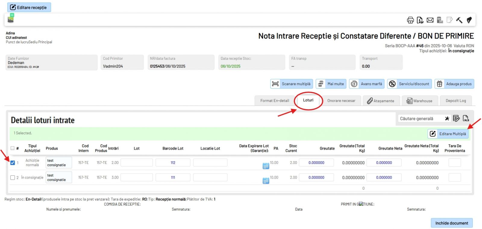 Varianta 2.Editarea recepției la nivelul loturilor de la secțiunea „Loturi” și modificarea tipului de achiziție pentru unul sau mai multe loturi recepționate: