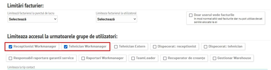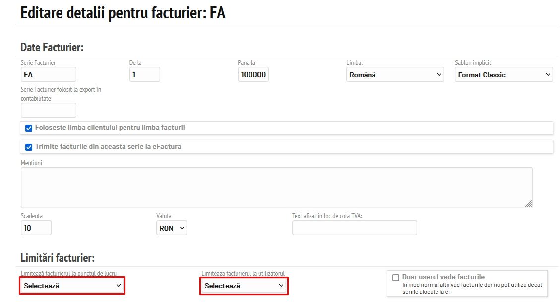 După ce se configurează seria și numărul facturii, facturierul se poate aloca unui utilizator și se poate limita la un punct de lucru. Această opțiune se găsește la Vânzări - Facturi fiscale - Setări modul - Serii