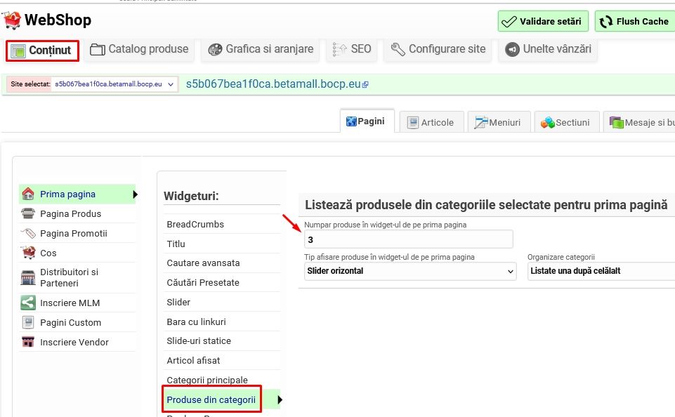 Din Conținut - Prima pagină - Produse din categorii se poate configura câte produse să fie afișate și cu ce aspect.