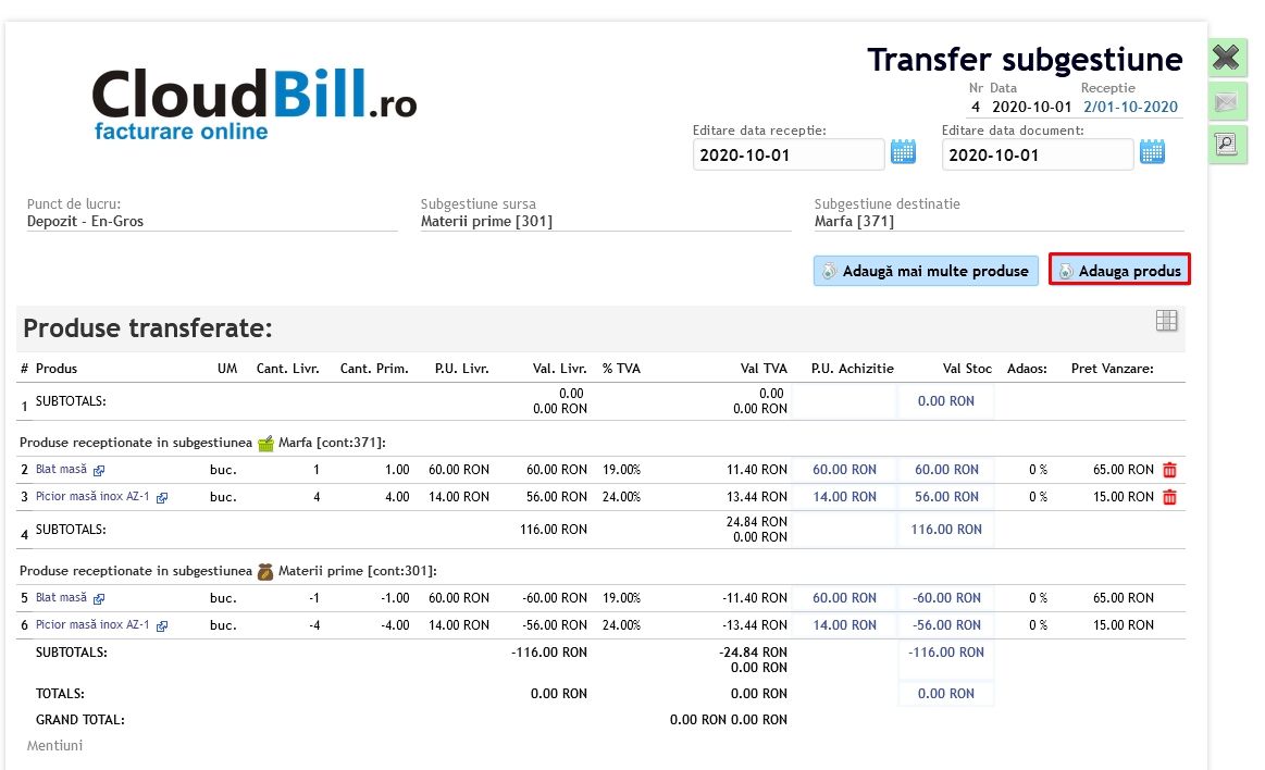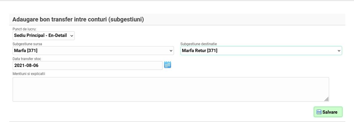 Se aleg subgestiunile sursă și destinație cât și punctul de lucru după care se salvează și se adaugă produsele (unul sau mai multe):