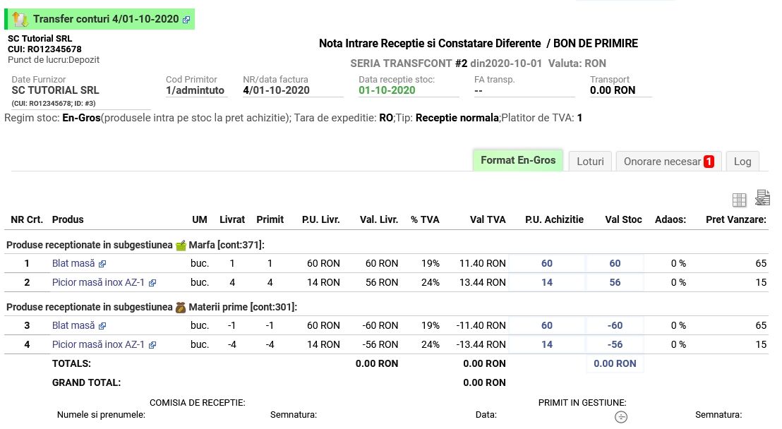 Se poate accesa și recepția direct de pe bon, și vice versa, orice recepție generată automat pentru un bon de transfer conturi va conține automat și link către bonul de transfer: