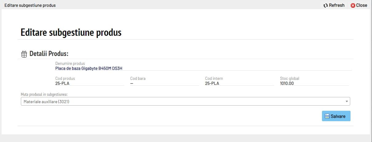 Opțiunea apare doar la utilizatorul admin și este strict pentru corectarea situației unor produse incorect create și ideal ar fi să fie utilizată în cazul în care produsul este nou creat și nu are mișcări din lunile anterioare întrucât schimbarea subgestiunii pe fișa produsului poate cauza modificări de valori retroactive în rapoarte.
