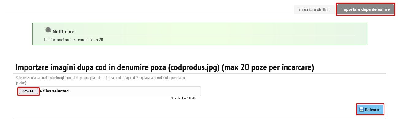 Dacă se dorește încărcarea mai multor imagini la același produs, se extinde denumirea imaginilor, păstrând denumirea inițiala după cod.