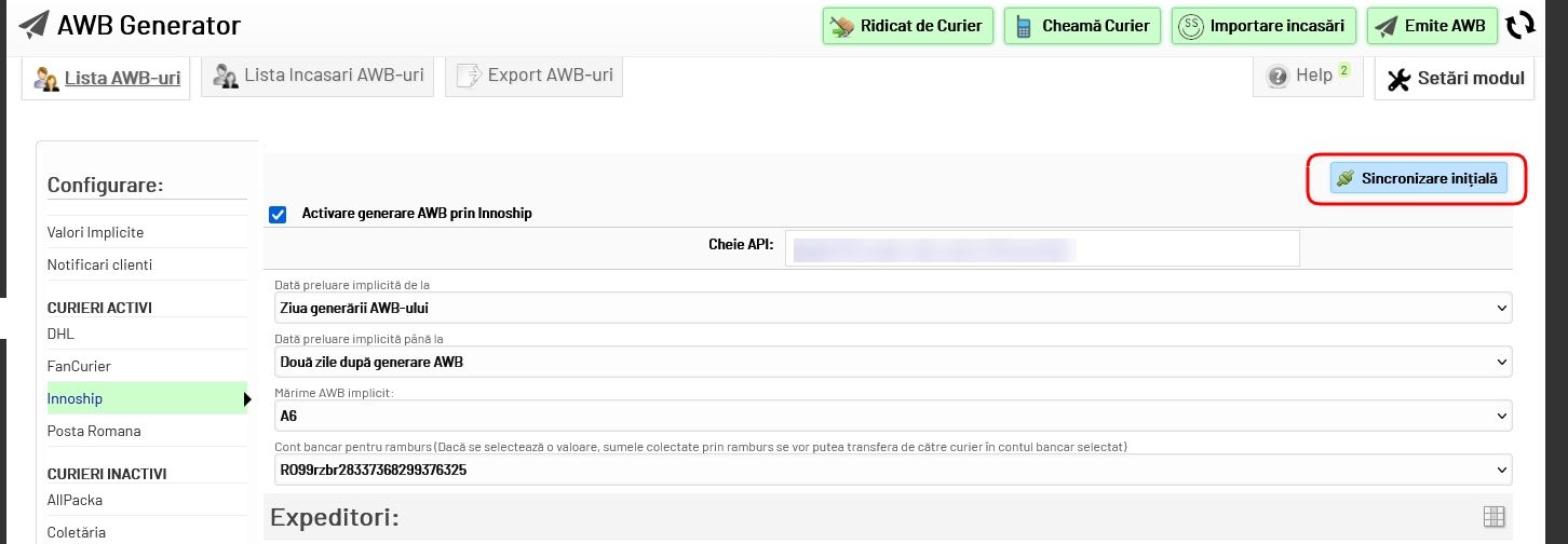 3. După sincronizare se va completa automat lista de Expeditori definiți în contul de Innoship sincronizat.