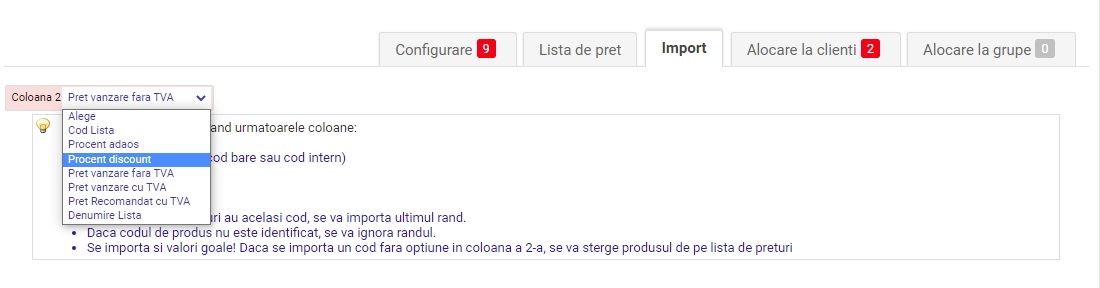 Regulile de preț se pot defini și printr-un import customizat din excel la tab-ul de Import unde prima coloană trebuie să fie Cod produs, iar a doua coloană opțiunea selectată.