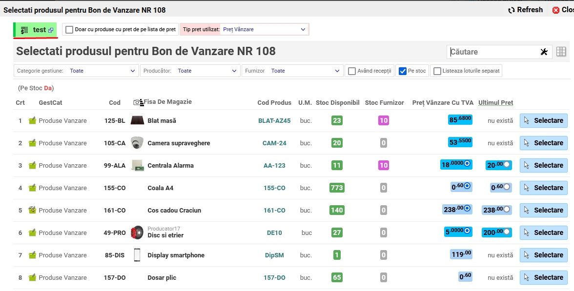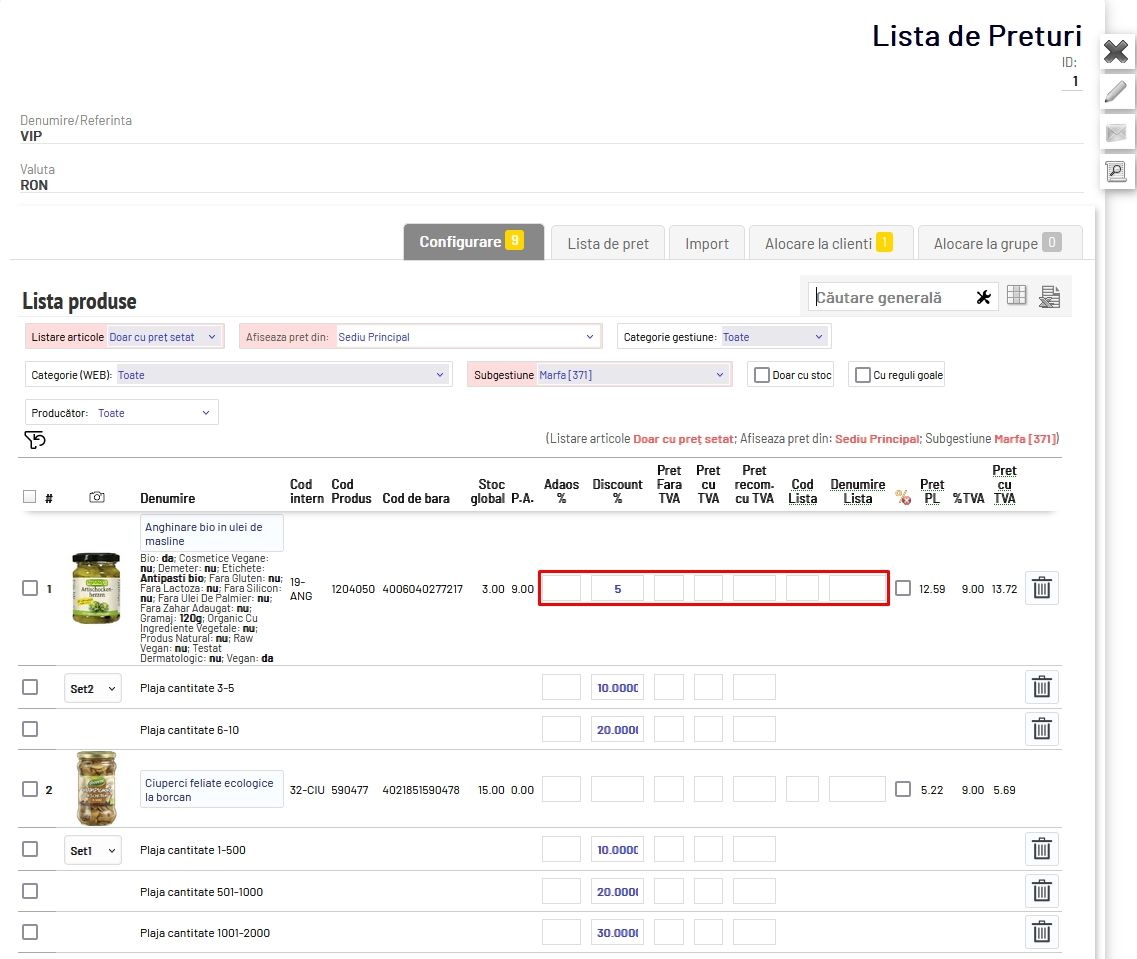 - la selectare o să vedem evidențiat cu altă culoare unde lista de preț conține un preț definit