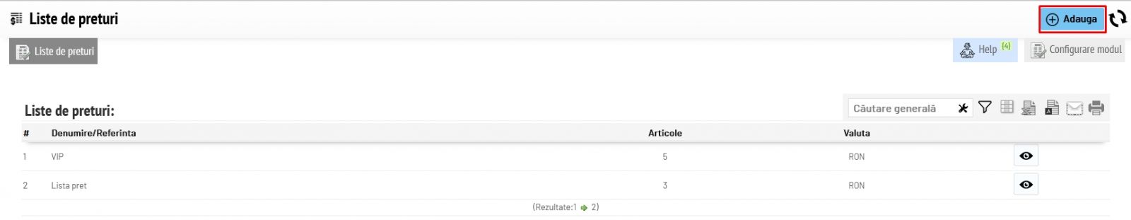 La accesarea modulului se regăsește tabelul cu liste de prețuri, unde cu butonul Adaugă se poate defini o listă nouă: