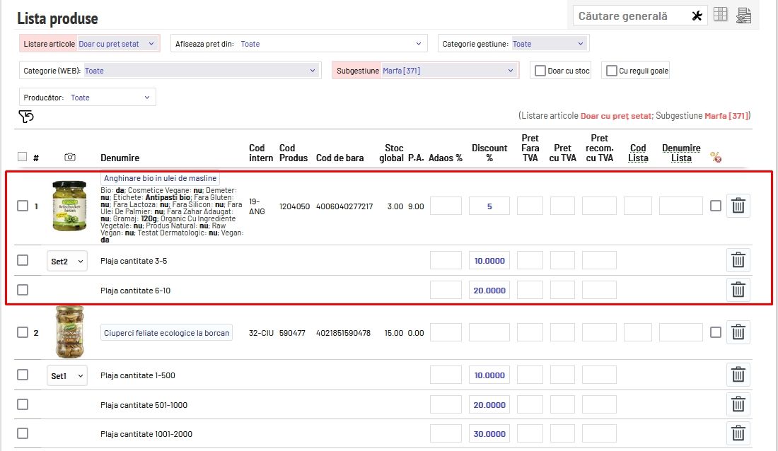 Pentru fiecare produs în parte, se poate selecta setul de plaje dorit și se poate defini regula pe plaje de cantitate care este alocat setului respectiv.