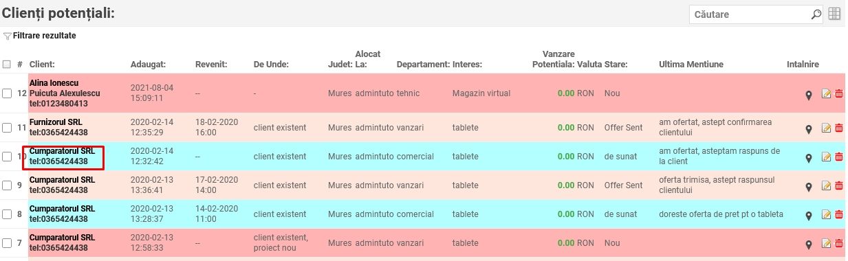 Ulterior se poate reveni la fișa lead-ului apăsând pe denumirea clientului din lista de clienți potențiali sau pe iconița din dreptul denumirii pentru a deschide fișa într-o fereastră nouă.