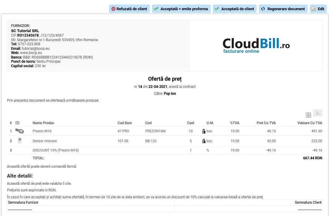 Oferta de preț se poate marca acceptată sau refuzată de client pentru a urmări comenzile valide.