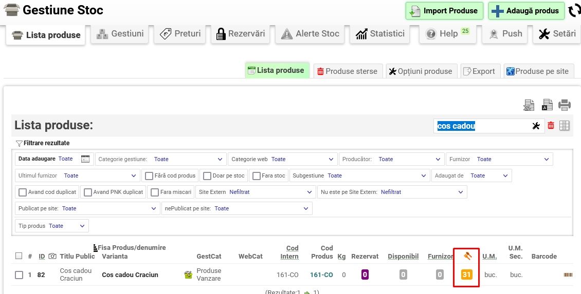 Apare în aplicație, la produsele care au rețetă de producție, o coloană cu stoc potențial, adică cantitatea ce ar fi posibil de produs din materiile prime sau componentele disponibile.