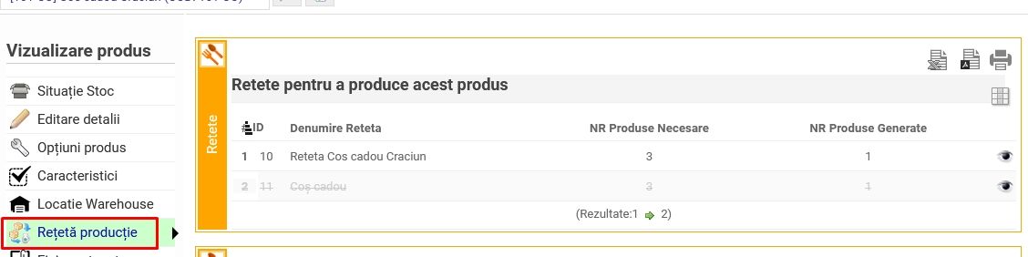 Stocul fictiv este calculat automat la produsele care au o rețetă de producție, astfel este necesar doar să se creeze o rețetă: