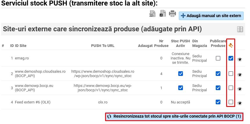 - în cazul în care s-a schimbat un stoc fictiv, se va trimite noul stoc fictiv la toate site-urile sincronizate care au opțiunea activă pentru a primi și stocul fictiv