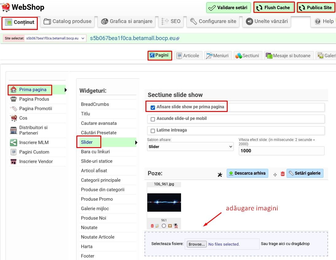 Pentru a afișa un slider pe site și a adăuga poze noi se accesează meniul CloudMart - Webshop - Conținut - Pagini - Slider și se bifează opțiunea Afișare slide show pe prima pagină. După ce imaginile au fost încărcate se apasă butoanele Flush Cache și Publică site.