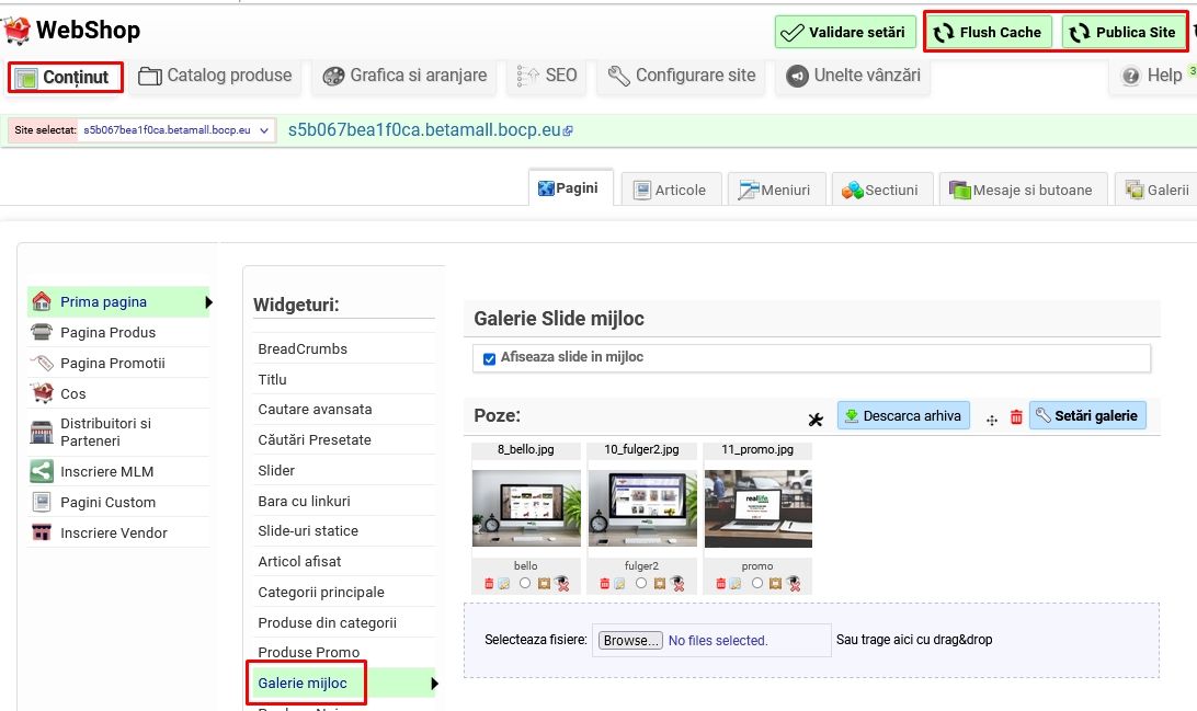 - se accesează meniul Website - Webshop - Conținut - Pagini - Galerie mijloc