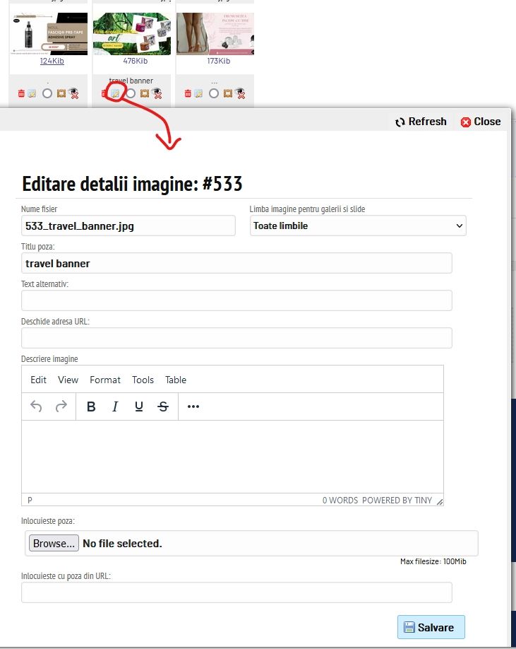 Sub fiecare imagine este o iconiță pentru editare care deschide un formular unde se pot introduce mai multe detalii: