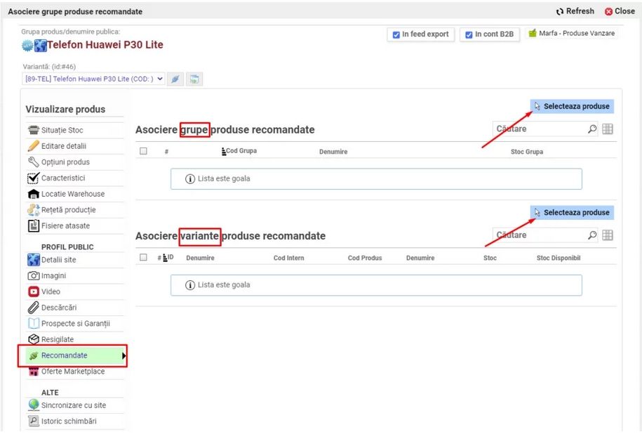 Se poate asocia o grupă de produse recomandate sau o variantă a unui produs recomandat. În general recomandăm asocierea unei grupe.