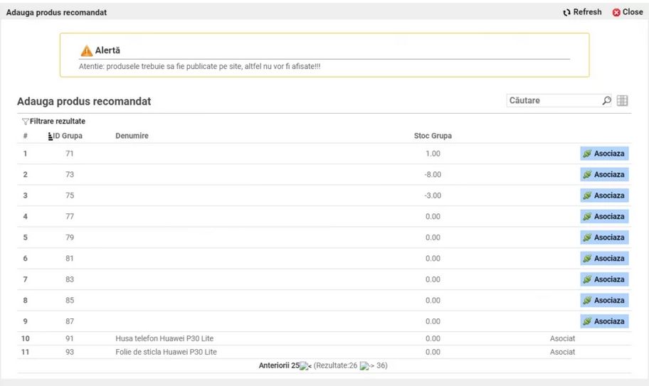La un anumit produs se pot selecta mai multe grupe de produse. Este necesar ca aceste produse să fie publicate pe site pentru a fi afișate ca produs recomandat.