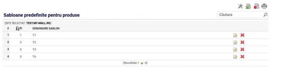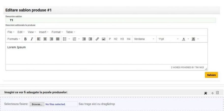 Acest modul permite denfinirea mai multor șabloane pentru produsele de pe webshop. Pentru fiecare sablon se poate încărca una sau mai multe poze și o descriere.