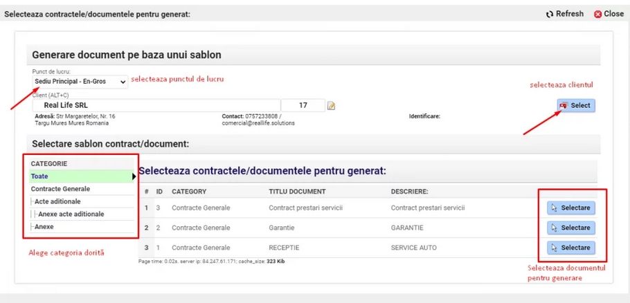 Pentru a genera un contract sau orice alt document se apasă Contract Nou. Se selectează punctul de lucru din care se va genera documentul și clientul, apoi se selectează șablonul dorit și se va genera documentul.