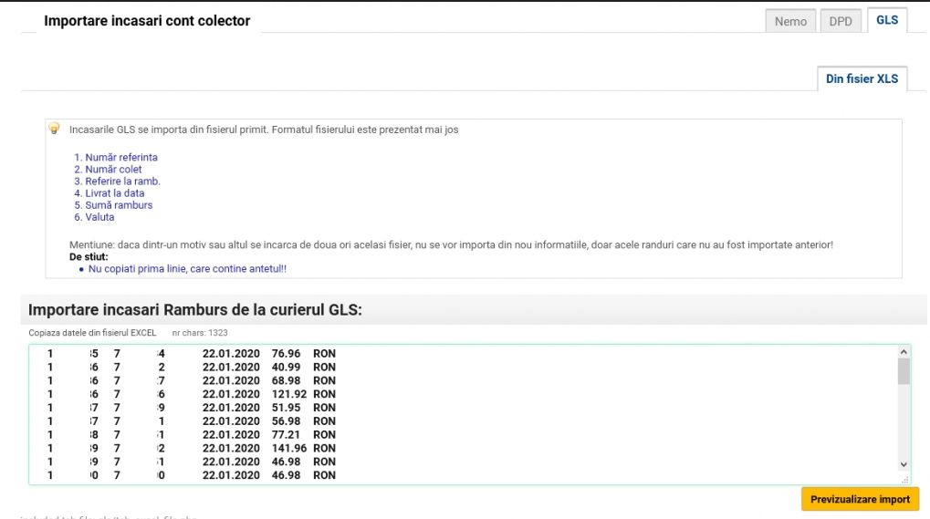2) în BOCP se accesează meniul Documente - AWB generator - Importare încasări - GLS și se inserează datele.