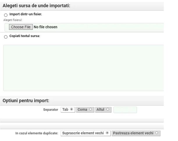 și există opțiunea de a selecta fișierul de import sau selectarea datelor din fisierul de import cu Ctrl+C și apoi inserarea lor cu Ctrl+V în fereastra de sub “Copiați textul sursă”.