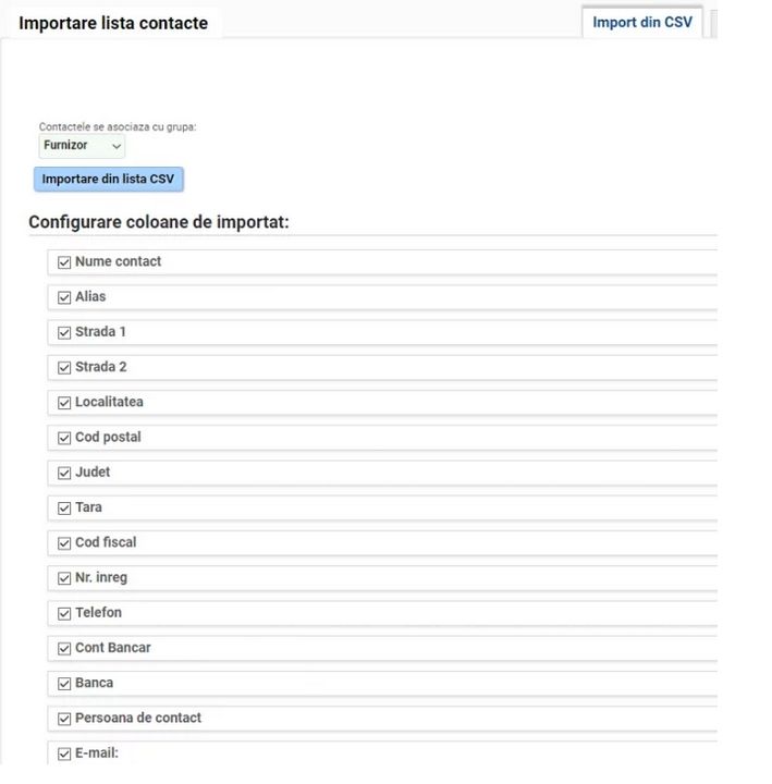 Prima dată se selectează coloanele de importat bifând căsuța din dreptul datelor de importat. Se pot bifa doar coloanele cu date obligatorii pe care le alegem în Setări modul -> Câmpuri obligatorii pentru agendă.