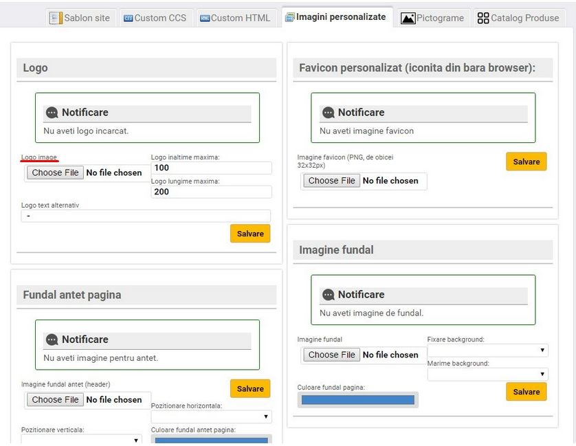Pentru a încărca logo-ul firmei pe site, se accesează meniul CloudMart - Webshop - Grafică și aranjare - Imagini personalizate - Logo image