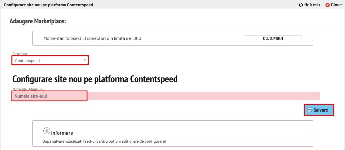 Acest feed se configurează accesând meniul Integrări - Conector eCommerce și se apasă butonul +Conectează un nou site, apoi se selectează din listă ContentSpeed și se completează adresa URL a site-ului.