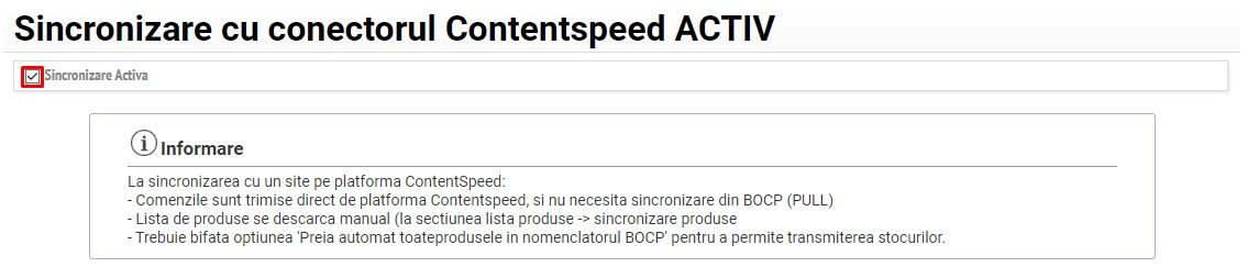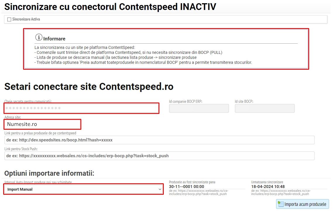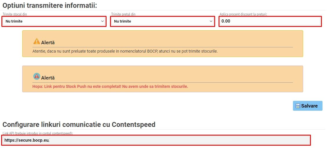 Se completează link-urile conform exemplelor din imagine, opțiunile de importare și transmitere informații și introduceți link-ul API în contul dvs ContentSpeed.