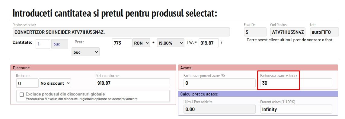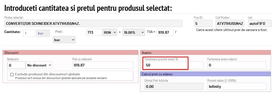 Pentru cazul în care se facturează un avans procentual pentru serviciile prestate sau pentru anumite produse, se emite factura fiscală, iar la adăugare produs/serviciu se completează rubrica Avans cu procentul dorit.