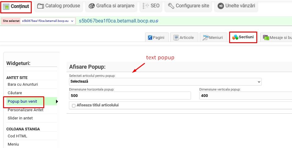 - Din meniul CloudMart - Webshop - Conținut - Secțiuni - Popup bun venit se selectează articolul și se definește mărimea ferestrei.
