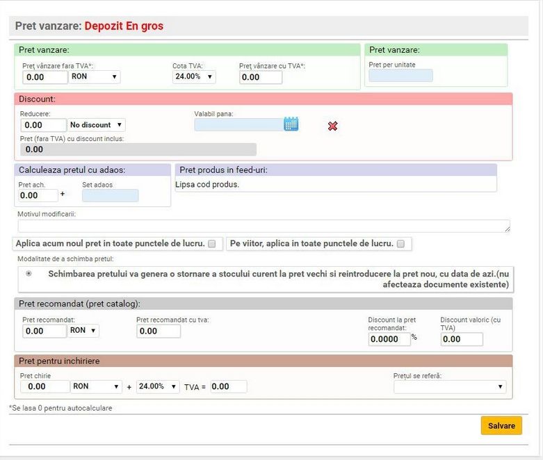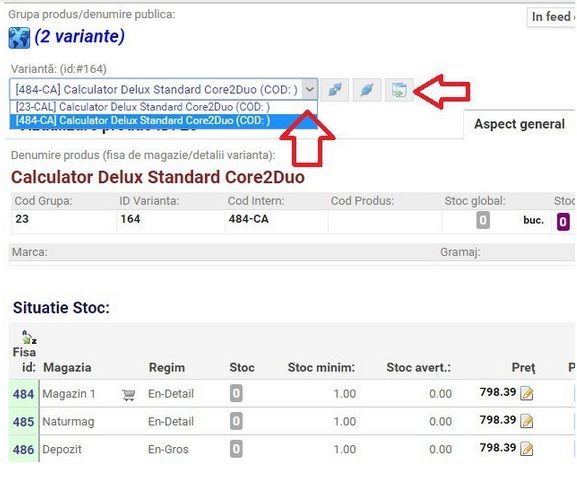 Produsele pot fi grupate și se pot crea variante (același produs cu alte caracteristici, mărime, culoare, etc.)