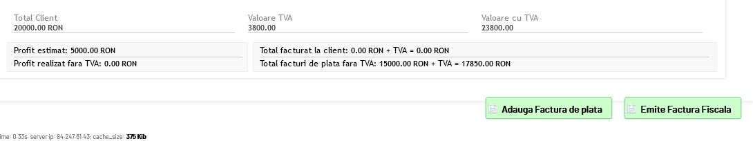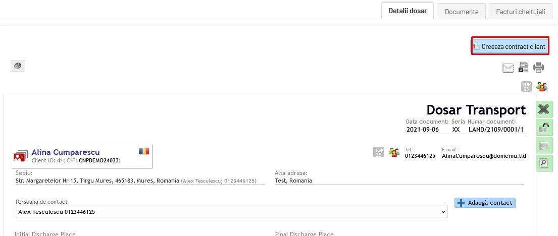 După finalizarea dosarului, cu un singur click se poate emite factura fiscală, se poate adăuga la cheltuieli factura care trebuie achitată transportatorului și se pot emite contracte atât pentru client cât și pentru transportator.