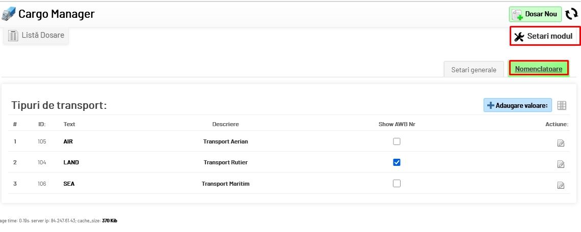 La tab-ul Nomenclatoare se definește tipul transportului (aerian, rutier, maritim).