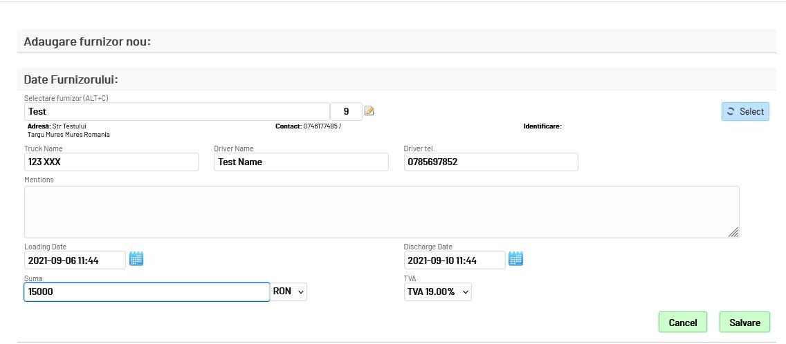Apoi se selectează furnizorul care asigură transportul, completând datele șoferului și suma pentru care furnizează serviciul.