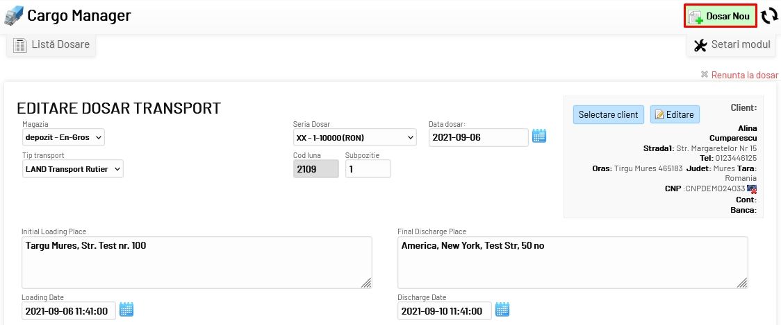Acest modul permite centralizarea tuturor informațiilor referitoare la un transport prin crearea unui dosar.