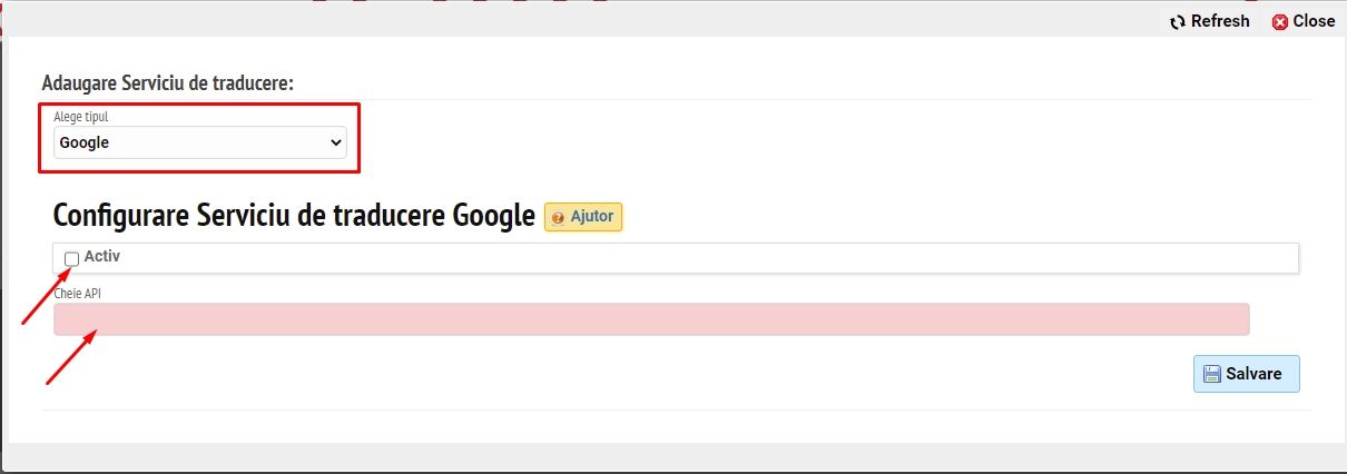 și se selectează din listă serviciul Google , apoi se completează cheia API și se setează serviciul Activ.