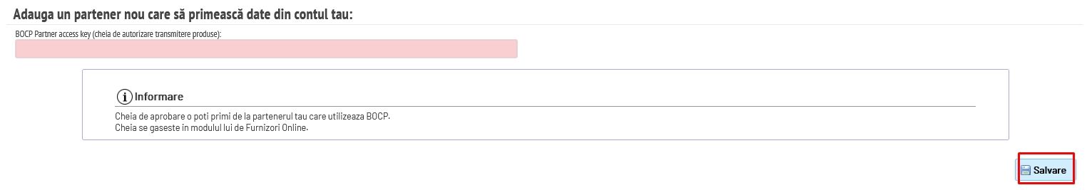 Se copiază cheia de la rubrica BOCP Access Key și se transmite partenerului de la care dorești să primești datele în contul tău.