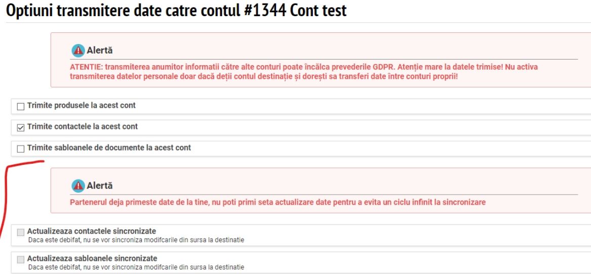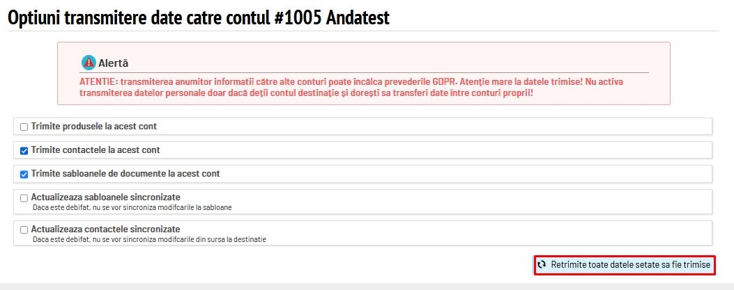 !!! Transmiterea anumitor informații către alte conturi poate încălca prevederile GDPR. Se recomandă transmiterea datelor doar între conturi proprii!!!
