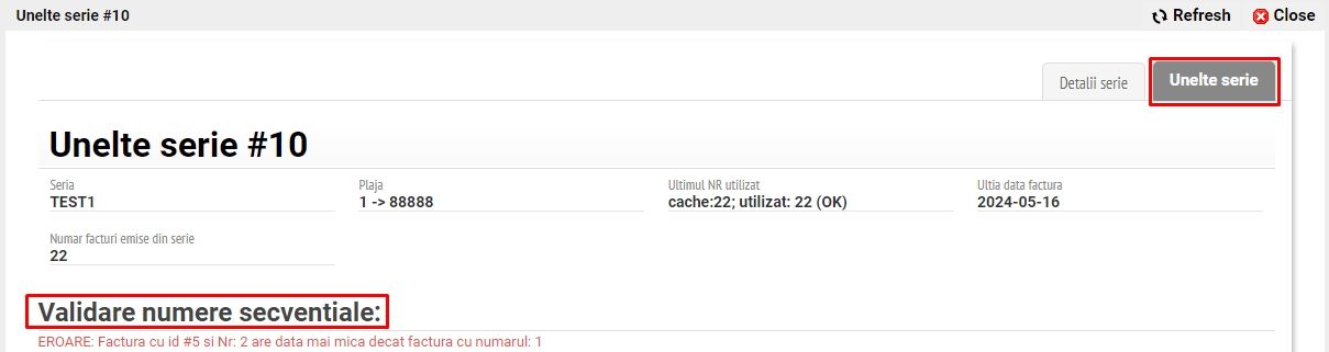 La editarea unei serie de factură fiscală se poate verifica dacă lipsesc numere sau dacă au fost duplicate și dacă numerele nu sunt alocate secvențial conform datei facturii (de exemplu dacă ulterior s-a modificat data).