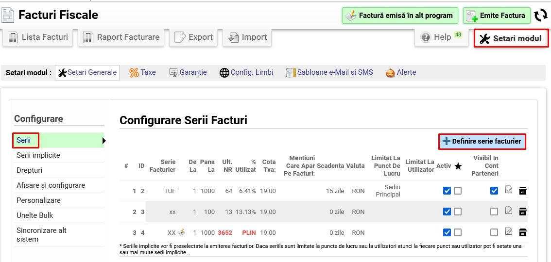 Se intră în modulul de Vânzari - Facturi Fiscale - Setări modul - Definire serie facturier
