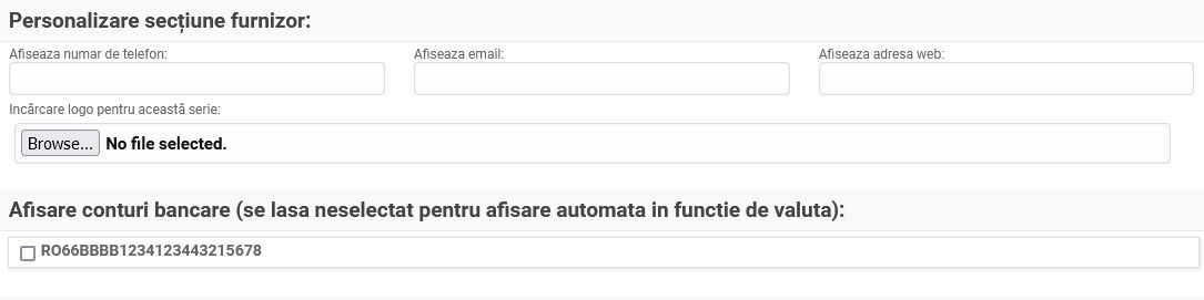 Se poate personaliza secțiunea de furnizor, astfel dacă se completează informațiile pentru serie, aceste opțiuni vor suprascrie setările globale, astfel putem specifica număr telefon, email, adresa web și logo personalizat pentru fiecare serie în parte.