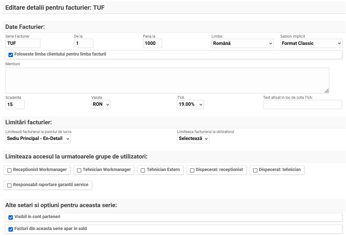 - la limitări se pot configura punctul de lucru unde va fi folosit facturierul și persoana sau grupul de utilizatori care poate să îl utilizeze