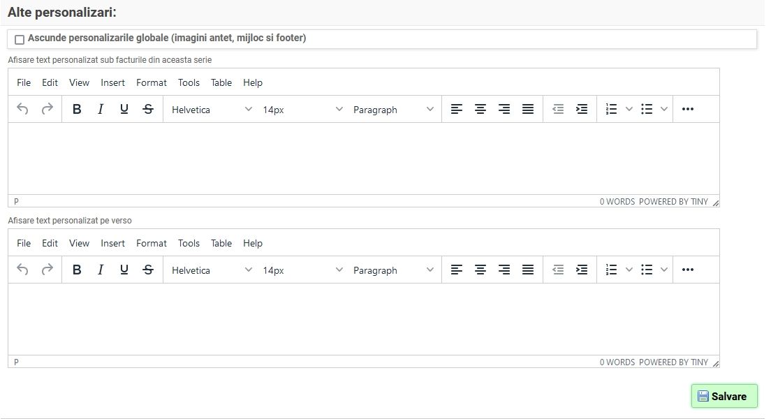Pentru a introduce un text predefinit pe partea de jos a facturii sau pe verso se poate completa secțiunea aferentă la configurarea seriei: