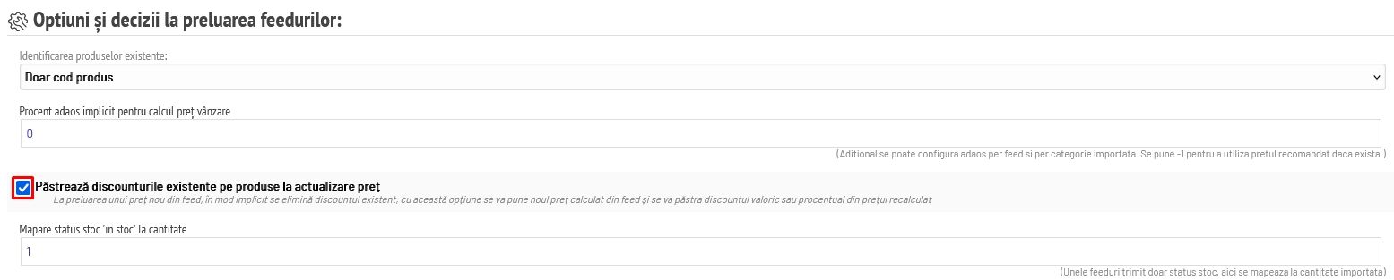 Atunci când se actualizează prețul pe baza unei schimbări din feed există opțiunea de a păstra sau nu a păstra discountul aplicat pe prețul produselor, astfel: