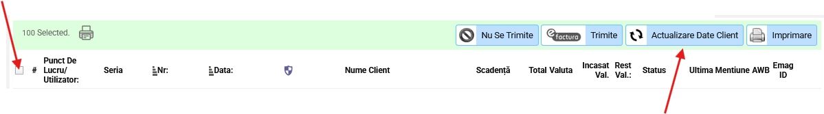 , se selectează în bulk toate facturile și se apasă butonul Actualizare Date Client