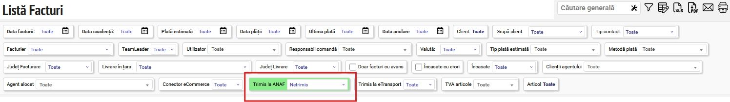 Aceste facturi se pot afișa la Vânzări - Facturi aplicând filtrul Trimis la ANAF: Netrimis