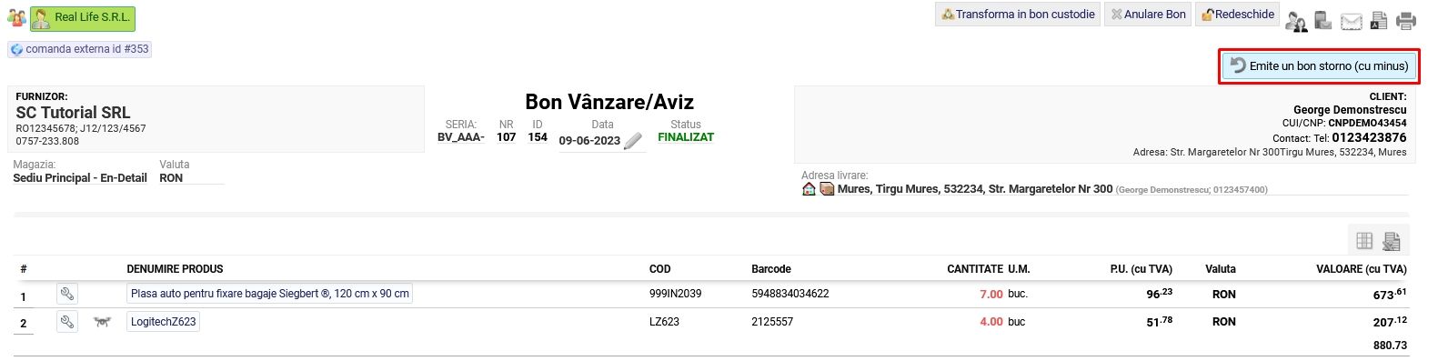 În același timp dacă se stornează o factură fiscală prin factura storno se va crea și un bon vânzare storno aferent bonului de vânzare inițial.