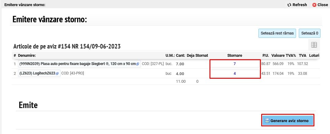 Se modifică cantitatea stornată în câmpul Stornare (dacă se dorește stornare parțială) sau se lasă cantitatea așa cum este pentru stornare completă și se apasă butonul Generare aviz storno.